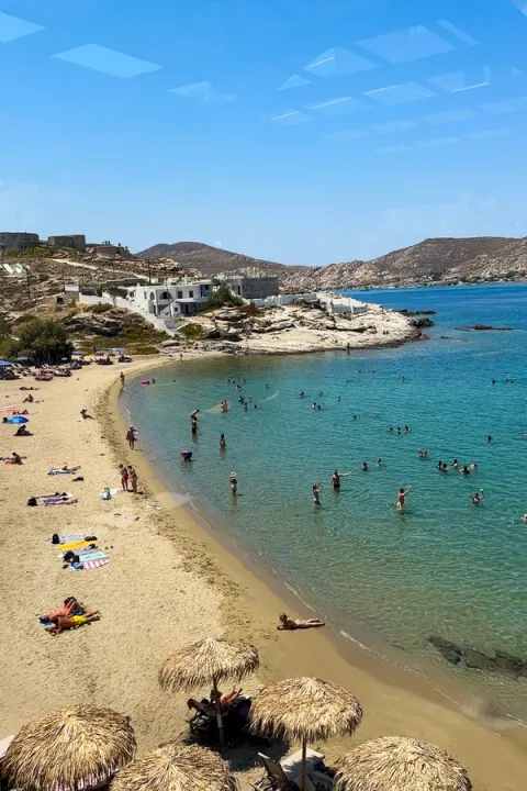 Santa Maria Beach is larger than Kolymbithres, more social, and great if you want beach bars and music without Mykonos-level intensity. There are organized beach sections with sunbeds and music, but it never feels too intense. It’s a great all-day beach spot.